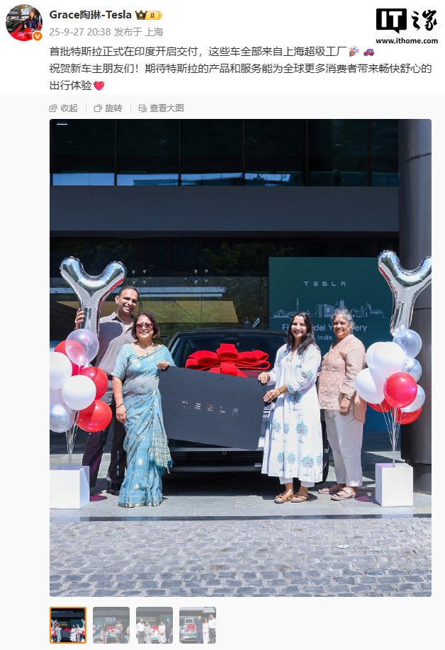 IT之家 9 月 27 日消息,特斯拉公司副总裁陶琳刚刚宣布,印度首批特斯拉 Model Y 正式交付,这批车型全部产自特斯拉上海超级工厂。