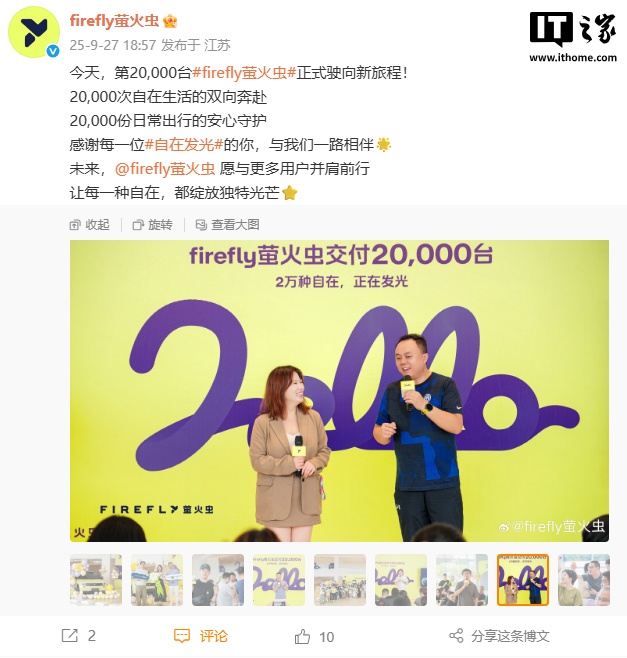 IT之家 9 月 27 日消息,蔚来纯电小车 firefly 萤火虫于今年 4 月 19 日正式上市,官方指导价 11.98~12.58 万元。五个月之后,第 20,000 台 firefly 萤火虫今天正式宣布交付。