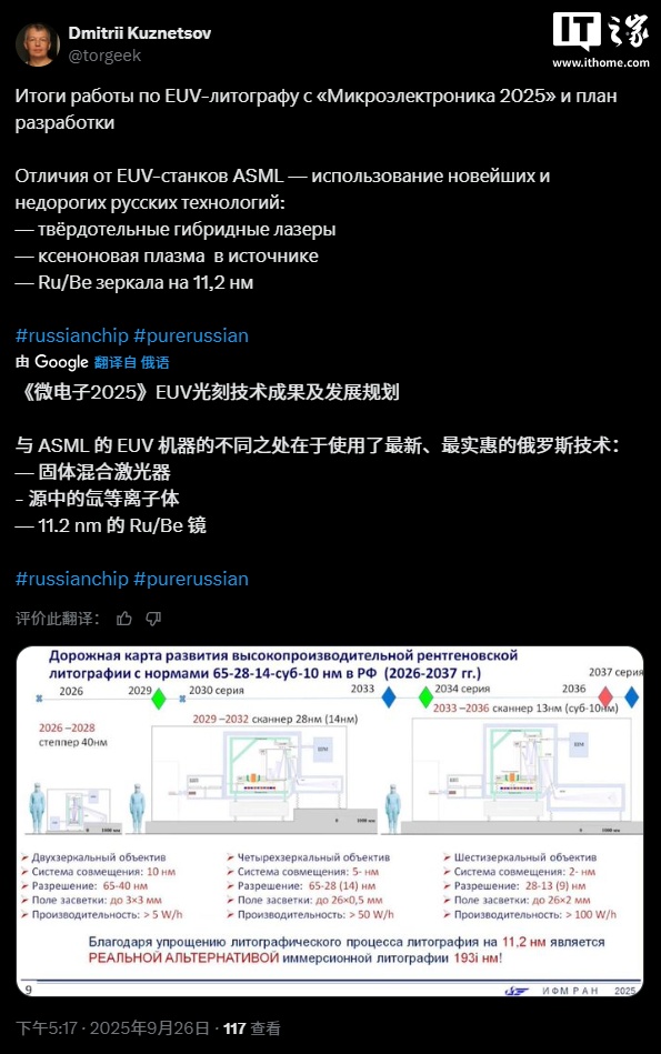 IT之家 9 月 28 日消息,据 Tom's Hardware 报道,俄罗斯科学院微结构物理研究所(由德米特里・库兹涅佐夫披露)公布了一项国产极紫外(EUV)光刻设备的长期路线图,该设备工作波长为 11.2 纳米,是对该机构去年 12 月披露信息的补充与延伸。新项目周期始于 2026 年,初期将采用 40 纳米制造技术,最终延伸至 2037 年,实现亚 10 纳米(sub-10nm)制程工艺。这份最新路线图相比以往部分规划更具现实可行性,但仍需证明其可执行性;此外,即便能够落地,该技术也可能不会用于商业用途。