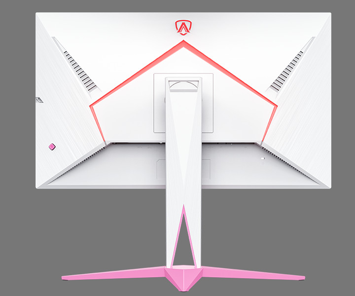 该显示器采用粉白双色外壳,背面包含爱攻电竞 Light FX 音乐律动炫彩氛围灯效组件,提供伸缩式耳机挂钩,还提供了 2 个 USB-A 5Gbps 外设接口。