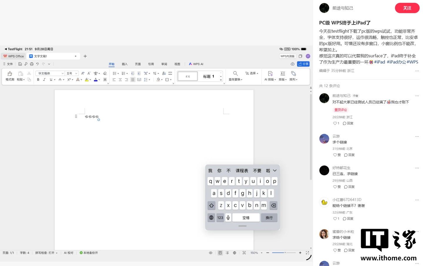 IT之家 9 月 28 日消息,今日有网友发现 WPS PC 版已推出苹果 iPad 版本测试,版本号 12.9.0 Build 22444,用户可以通过 TestFlight 体验(名额已满)。