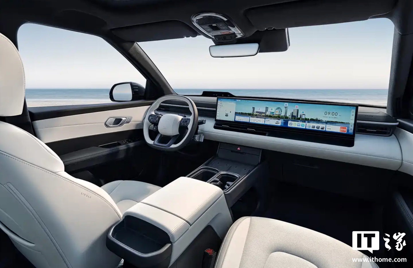 该车内饰采用大尺寸中控屏 + 副驾娱乐屏组成的 27 英寸一体式连屏设计,中控台取消了传统物理按键,同时标配 HUD 系统,支持普通 / 极简 / 地图三种显像模式自由切换。车辆匹配三辐式多功能方向盘,方向盘后侧设计了两个换挡拨片,拨动拨片即可切换 4 档动能回收模式,长按拨片还能激活单踏板模式与 AUTO 自动回收模式。