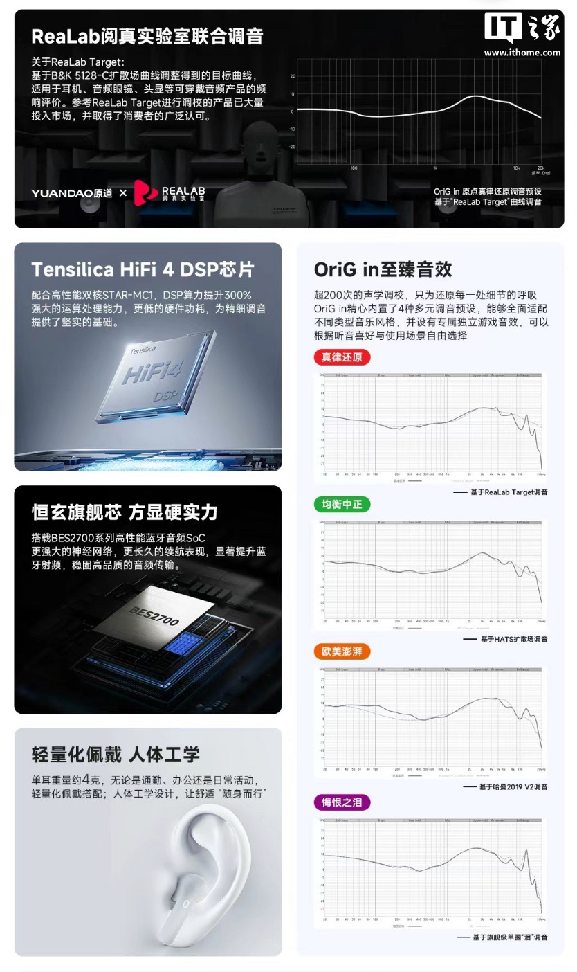 该耳机提供 12.4mm 单元,采用 Tensilica Hi-Fi 4 DSP 芯片,匹配 BES2700 系列高性能蓝牙音频 SoC,支持 LHDC V5 协议,支持 55dB 极限深度、3KHz 宽频降噪,全频段平均降噪深度可达 30dB,延迟低至 50ms。耳机同时联合 ReaLab 阅真实验室进行联合调音,提供 OriG in 音效,同时可使用原道专属 App 进行调参。