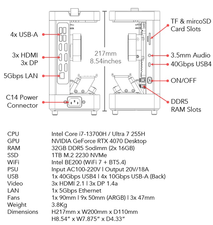 Wee Beastie 三维 200×110×217 (mm),内置 400W 电源,重 3.8kg,可放入背包中随身携带。其搭载英特尔酷睿 i7-13700H / Ultra 7 255H 移动端处理器和 MXM 格式的英伟达 GeForce RTX 4070 12GB 桌面端显卡。
