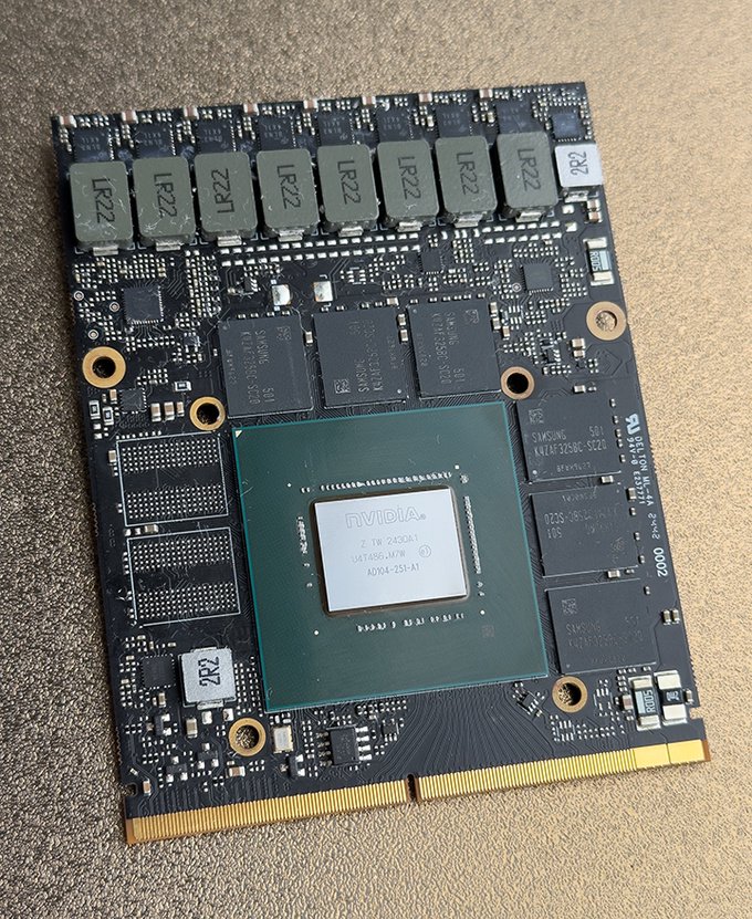 项目资料宣传这张 RTX 4070 采用 GDDR6X 显存,但展示的 MXM 显卡模块采用的是对应 GDDR6 版 RTX 4070 的 AD104-251-A1 核心与三星显存(仅美光供应 GDDR6X)。