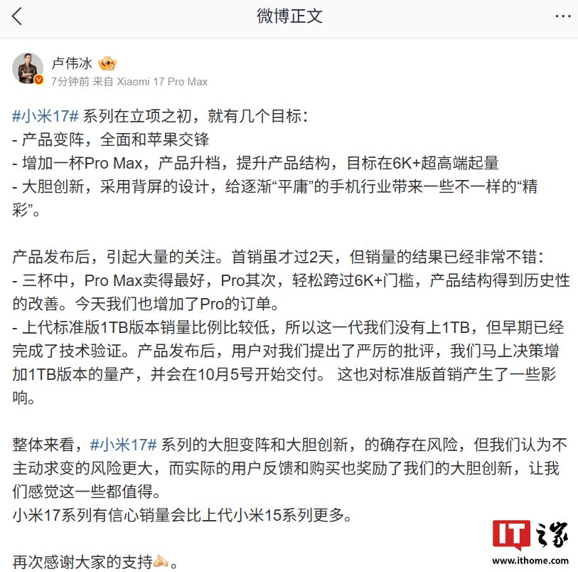IT之家 9 月 29 日消息,小米公关负责人王化今日发文称,目前没有任何削减订单的计划,因为新增了小米 17 标准版的 16GB+1TB 版本,加之 17 Pro 系列加单,产品的结构配比会发生改变,整体的产品订单会较上一代增加。
