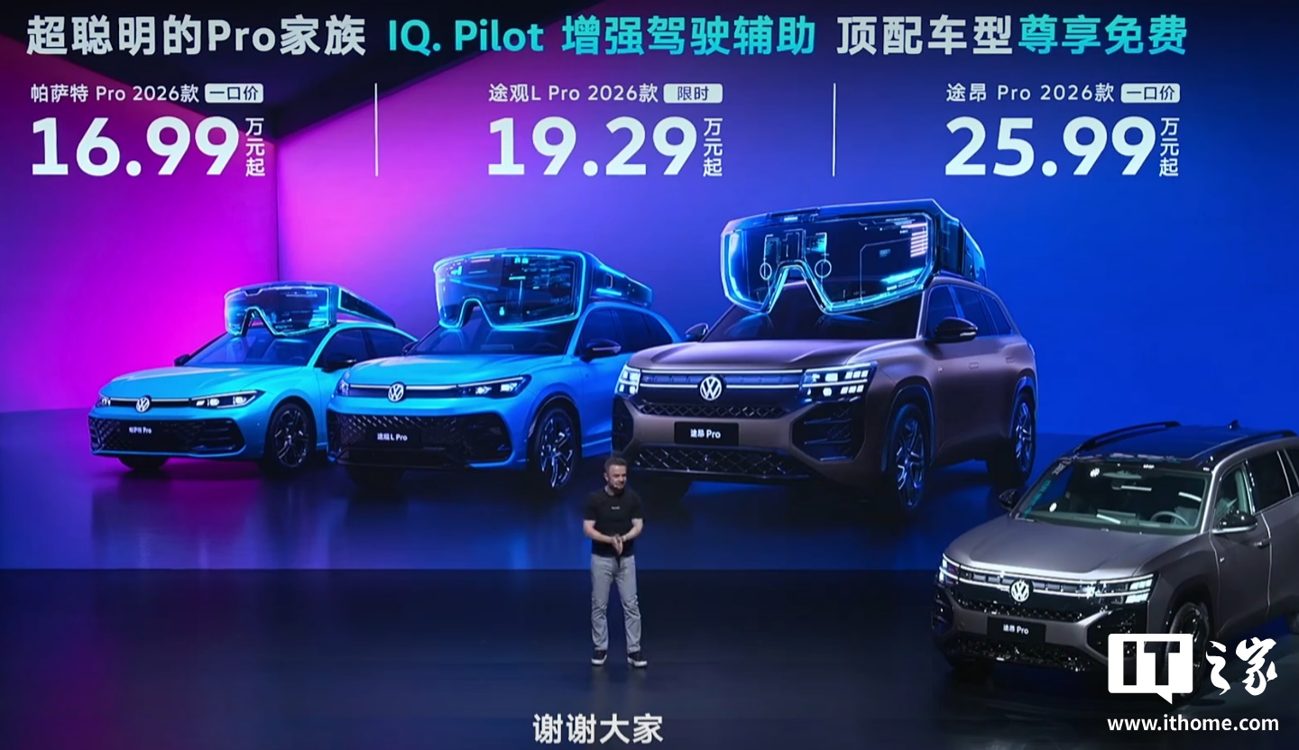 上汽大众为自家的 2026 款帕萨特 Pro、途观 L Pro、途昂 Pro 家族油车带来了卓驭辅助驾驶,可 5000 元选装,顶配版本免费赠送。