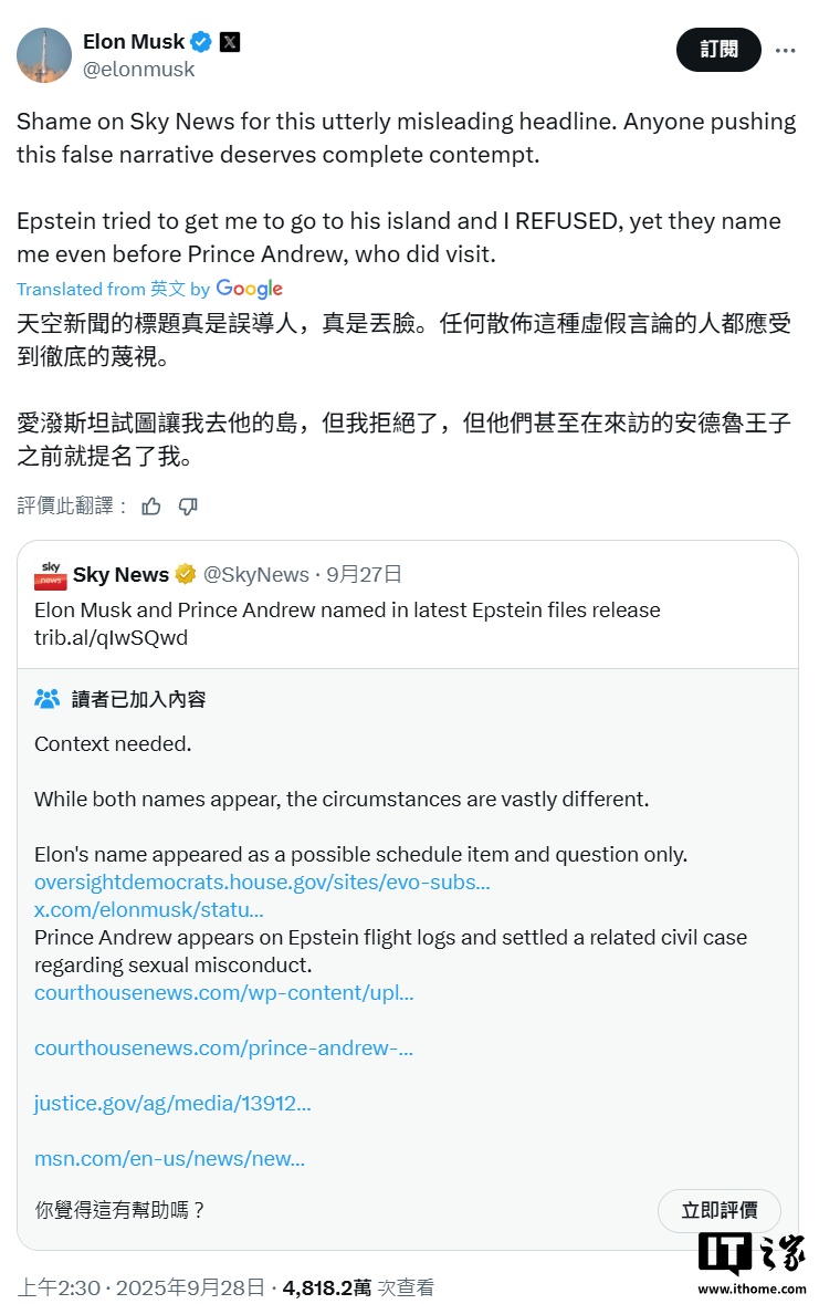 IT之家 9 月 29 日消息,特斯拉 CEO 埃隆・马斯克昨天在 X 平台发文,回应英国媒体《天空新闻台》关于自己被杰弗里・爱泼斯坦邀请的传闻。