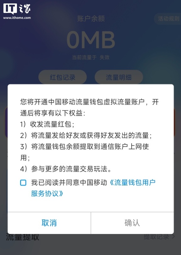 在流量钱包中,用户可以通过现金购买完成虚拟流量账户充值,并可以通过发红包、转赠等操作实现好友之间的流量流转和分享,也可以将虚拟流量提取到中国移动的通信账户中直接上网使用(有效期 24 小时)。
