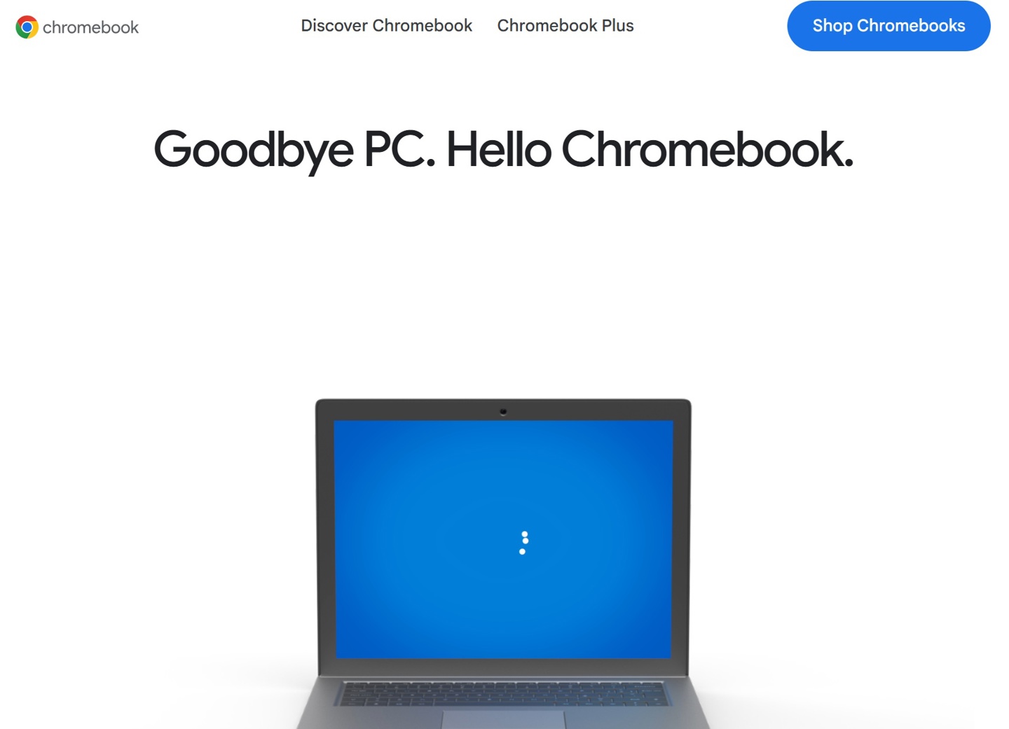用户点击“了解更多”按钮之后,会跳转到为“告别 PC,你好 Chromebook”的专门页面,广告配图的设计也充满调侃意味: