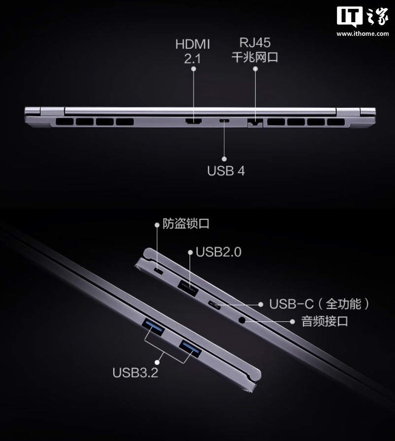 接口方面,该机左侧提供 1 个 USB-A 2.0 接口、1 个“全功能”USB-C 接口、1 个 3.5mm 音频接口;右侧提供 2 个 USB-A 3.2 接口;后侧提供 1 个 HDMI 2.1、1 个 USB4、1 个 RJ45 网口。