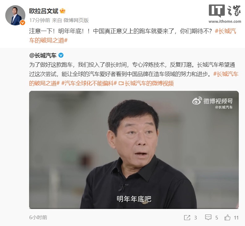 IT之家 9 月 30 日消息,长城汽车今日晒出一段央视《对话》栏目的视频,长城汽车董事长魏建军透露,长城汽车首款超跑将于“明年年底(2026 年底)”亮相。