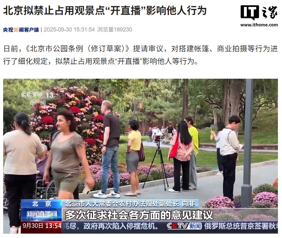 IT之家 9 月 30 日消息,据央视新闻今日报道,《北京市公园条例(修订草案)》日前提请审议,对搭建帐篷、商业拍摄等行为进行了细化规定,拟禁止占用观景点“开直播”影响他人等行为。