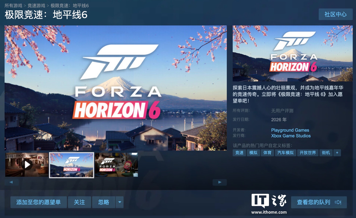 IT之家 9 月 30 日消息,微软赛车游戏《极限竞速:地平线 6》于 9 月 25 日公布,游戏背景首次设定在日本,目前本作已上架 Steam,玩家现可将其加入愿望单,IT之家整理商品页如下。