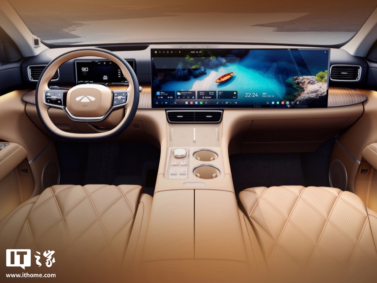 座舱方面,该车提供小尺寸液晶仪表盘和 30 英寸副驾驶双连屏,采用双辐式多功能方向盘。新车空调控制物理按键位于副仪表台区域,同时提供有前后四杯架、双手机无线充电板、360 度全景影像、分段式全景天窗、9.2 升冷暖冰箱、256 色音乐律动氛围灯和香氛系统。