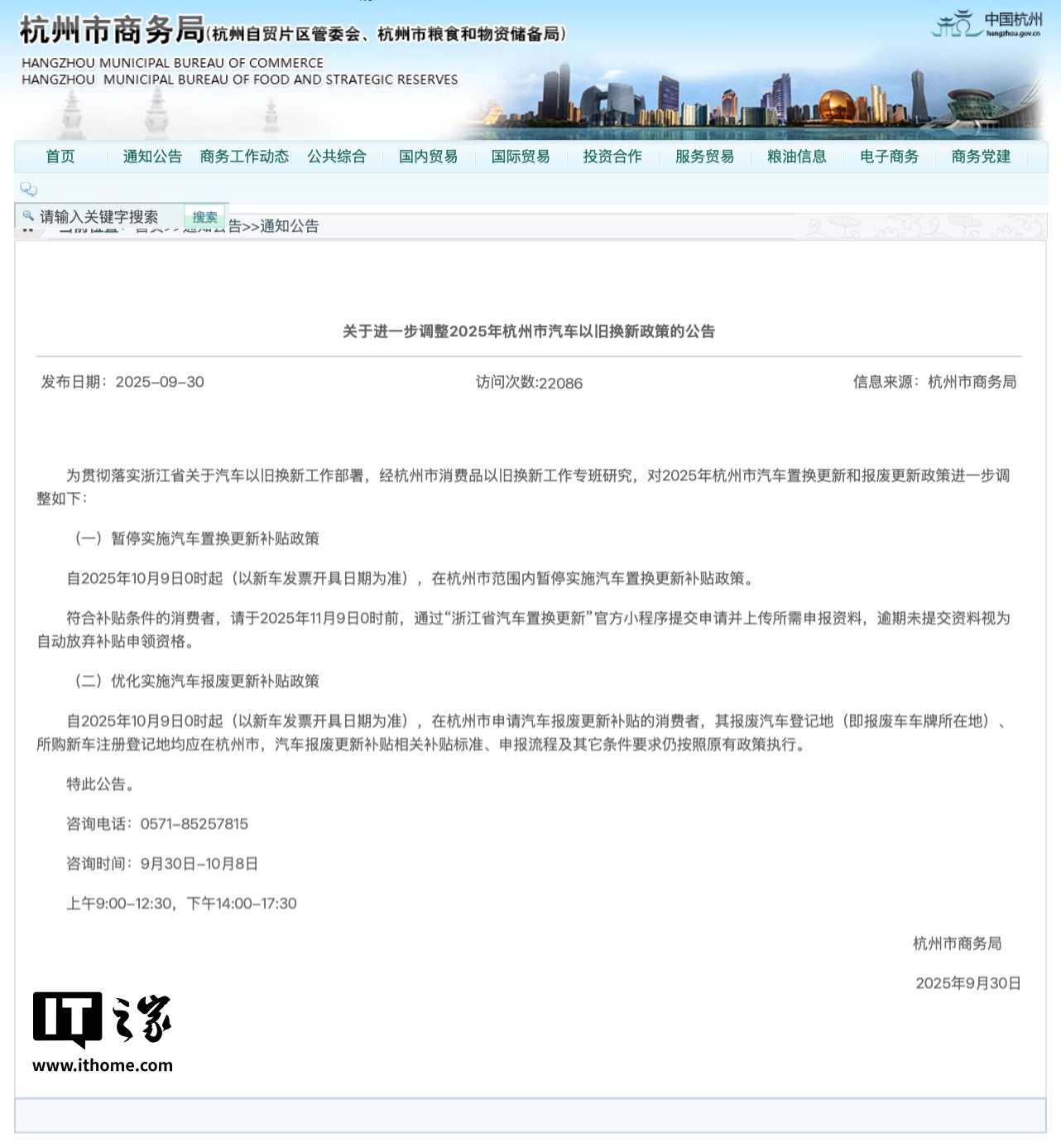 IT之家 9 月 30 日消息,杭州市商务局今天发布关于进一步调整 2025 年杭州市汽车以旧换新政策的公告,自 2025 年 10 月 9 日 0 时起,在杭州市范围内暂停实施汽车置换更新补贴政策。