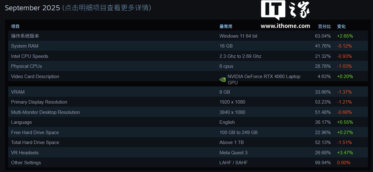 IT之家 10 月 2 日消息,Steam 昨日公布了 2025 年 9 月的软硬件调查数据。Steam 每月进行一次调查,收集客户正在使用的电脑软硬件种类的数据。调查非必须参加,且匿名进行。