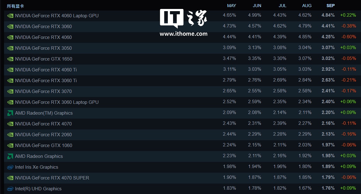 从显卡数据来看,RTX 4060 Laptop 重回第一,份额上涨 0.22%;RTX 4060 桌面版显卡份额下滑 0.6%,从第一降到第三。
