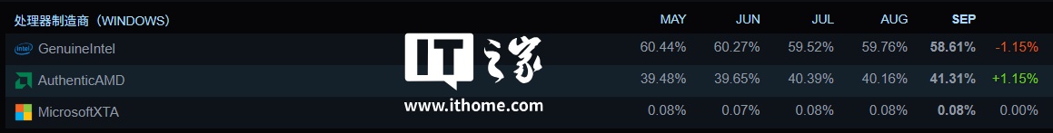 处理器方面,AMD 处理器在 9 月迎来份额增长,增加 1.15% 达到 41.31%;英特尔处理器则下降了 1.15%,来到 58.61%。