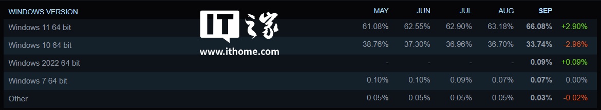 而在系统方面,Windows 11 份额上涨 2.90%,已达 66.08%;Windows 10 则下滑了 2.96%,还剩 33.74%。Windows 10 将于本月正式终止支持,届时用户将无法再获得最新的安全更新,推动更多用户升级到了 Windows 11 系统。