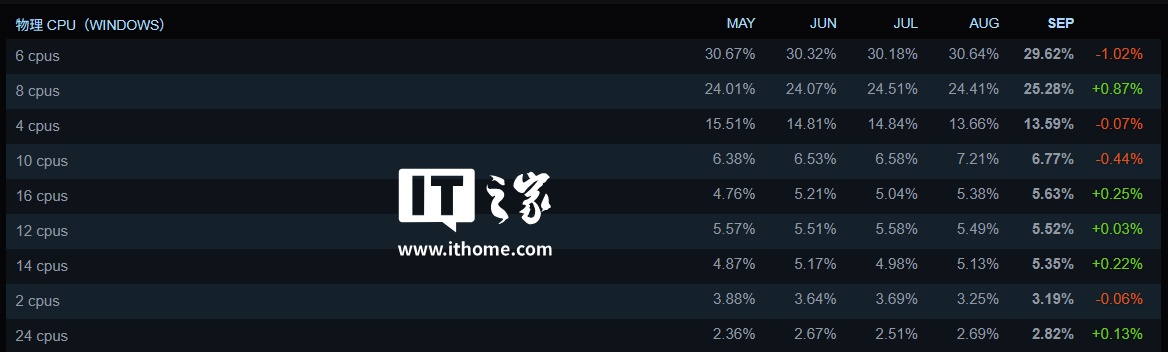 IT之家注意到,CPU 核心数量方面,6 核 CPU 的份额在 9 月首次下滑到 30% 以下,8 核 CPU 的份额则增长到 25.28%。