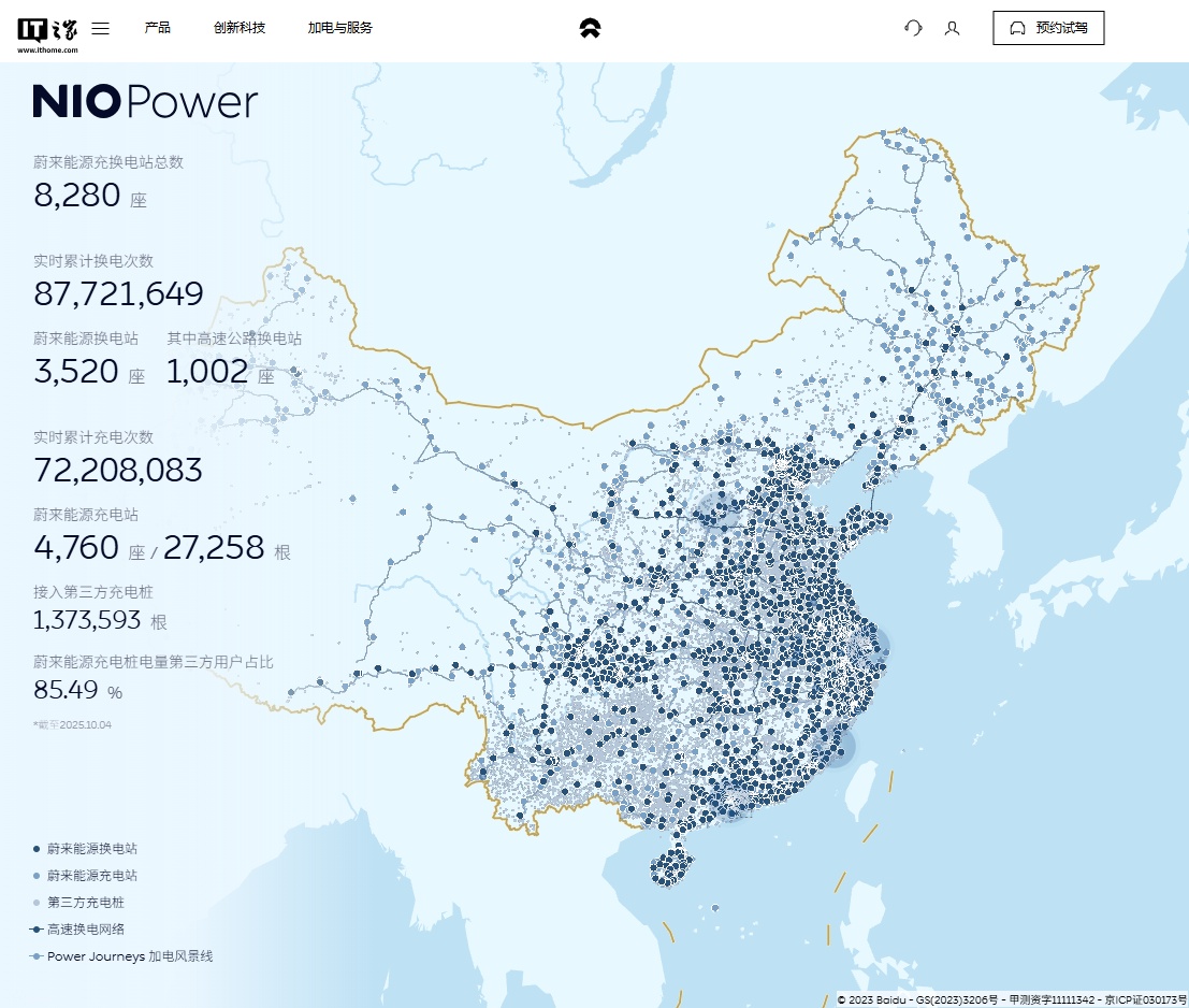 据IT之家此前报道,今年 9 月 20 日,蔚来宣布其第 3500 座换电站在杭州上城区富春路正式上线。截至发稿,蔚来能源充换电站总数为 8280 座,蔚来能源换电站 3520 座、高速公路换电站 1002 座、蔚来能源充电站 4760 座。