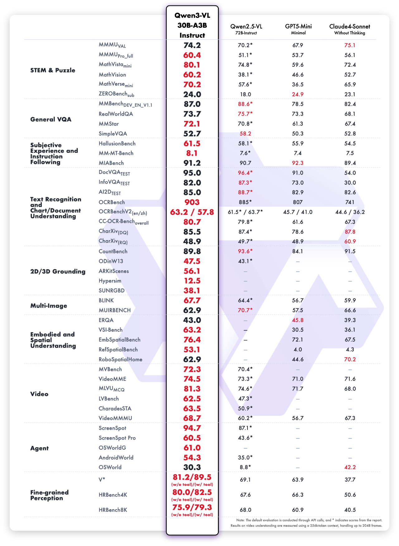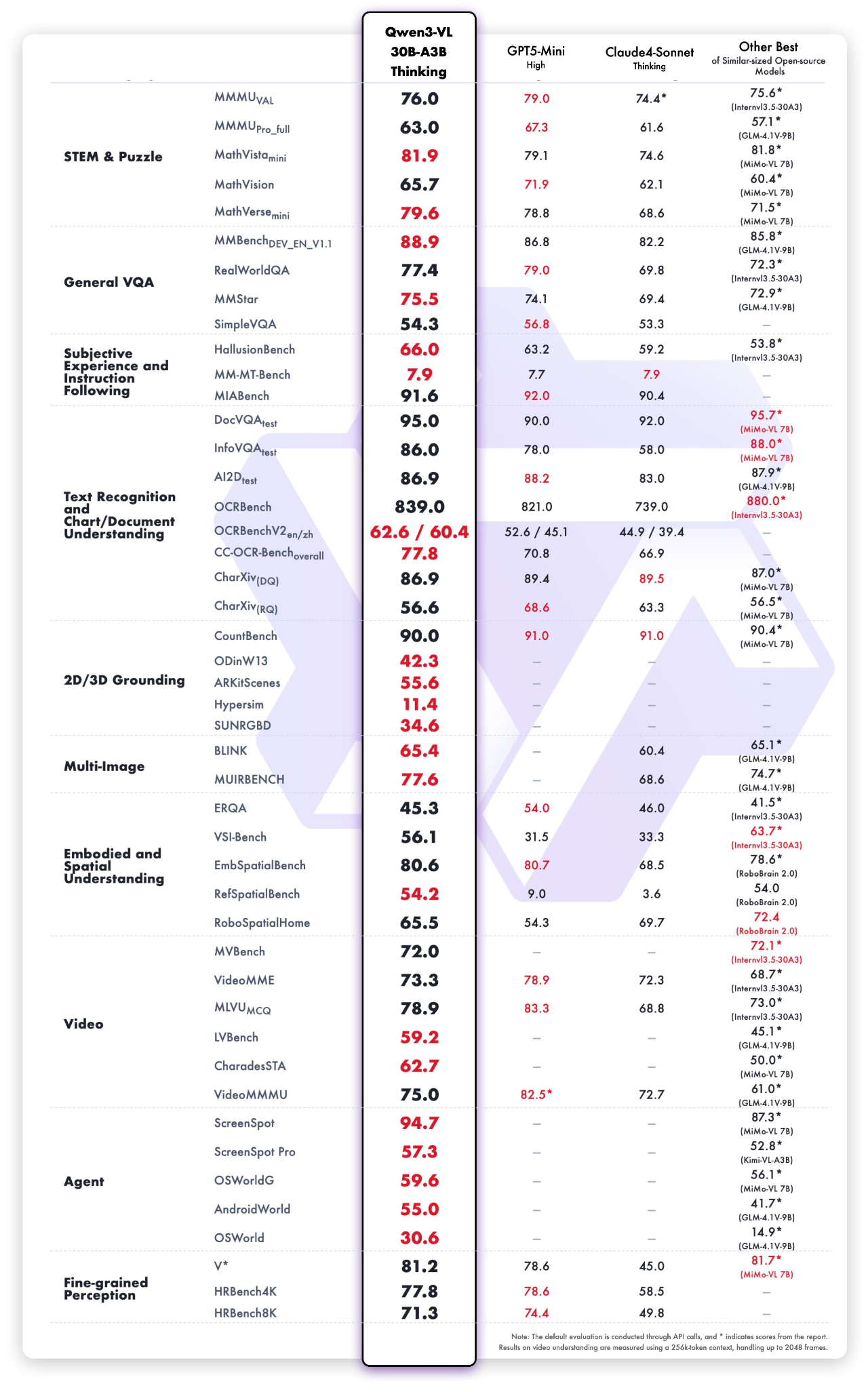 官方表示,Qwen3-VL-30B-A3B-Instruct 与 Thinking 体积更小,性能依旧强劲,更实现集 Qwen3-VL 全部能力于一身。仅需 30 亿激活参数,即可在 STEM、视觉问答(VQA)、光学字符识别(OCR)、视频理解、智能体(Agent)任务等多个领域媲美 GPT-5-Mini 和 Claude4-Sonnet,甚至表现更优。