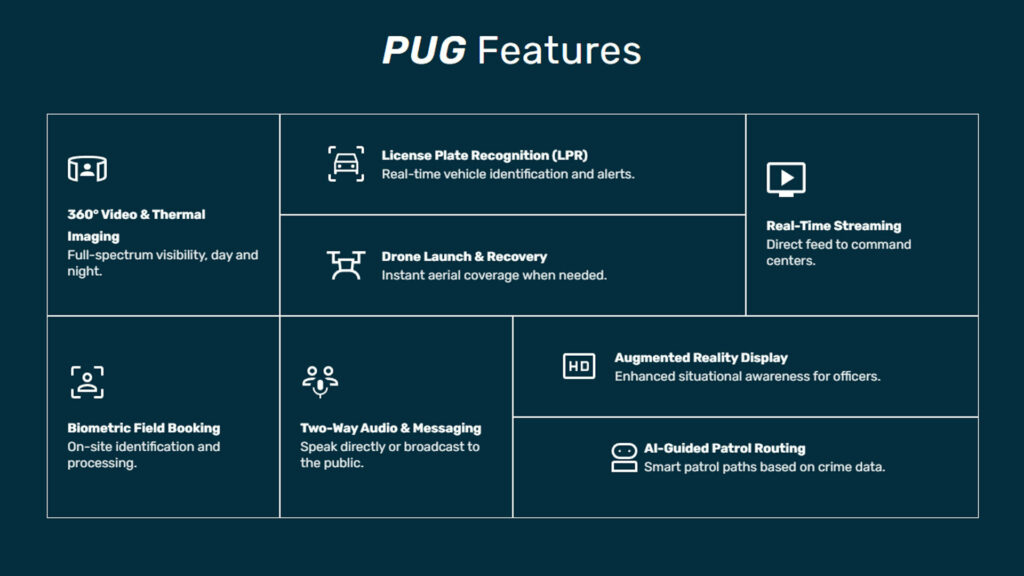 PUG 同时是一台移动监控平台,配有多组摄像头、热成像装置、车牌识别系统及无人机发射舱,可向执法部门实时传回数据,并在侦测到特定车牌时发出警报,用于追踪被盗车辆或请求支援。