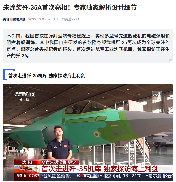 IT之家 10 月 5 日消息,据央视新闻今日报道,不久前,我国首次在弹射型航母福建舰上,实现多型号先进舰载机的电磁弹射和阻拦着舰训练。其中我国自主研发的首款隐身舰载机歼-35 再次成为全球关注的焦点。央视记者首次走进航空工业沈飞机库,独家探访正在生产的歼-35。