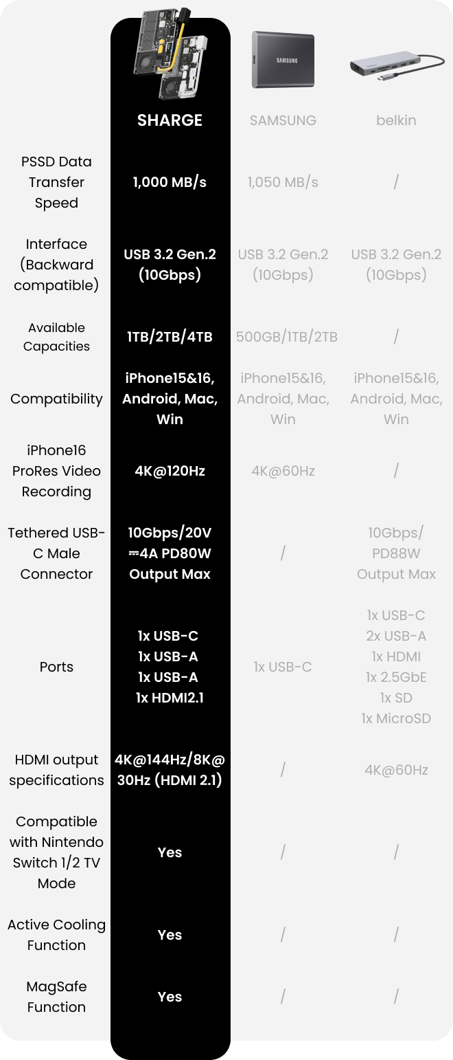 闪盘 Pro 本身仅有信用卡大小(90x61x11mm),重约 150 克,集成 4TB 移动存储、4 端口集线器于一体,传输速率可达 10Gbps,适用于 MacBook、iPhone、Switch 等产品,兼容 MagSafe,支持 HDMI 2.1(4K 144Hz / 8K 30Hz)视频输出、PD 100W 输入 / 80W 输出。