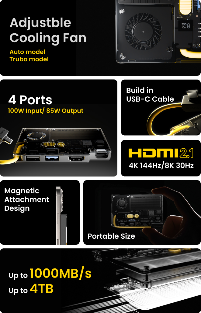 据介绍,这款产品创新多合一设计,采用磁吸式设计,可吸附电脑、手机背面,同时自带数据线,内置散热风扇,高速传输不惧发烫。