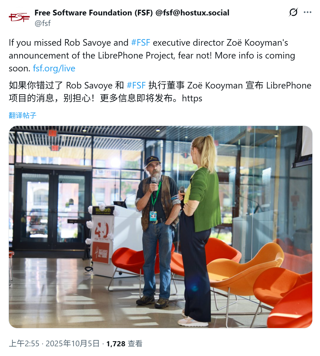 本次活动最重大的公告来自 FSF 执行董事 Zoë Kooyman,她正式发布了 LibrePhone 项目 —— 一项旨在将软件自由理念扩展至移动计算领域的新计划。