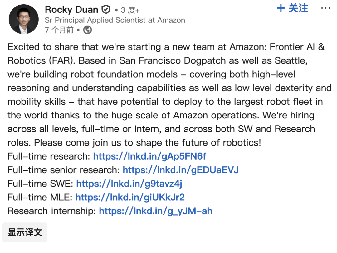 目前,由 Rocky Duan 担任 Amazon FAR 研究负责人。