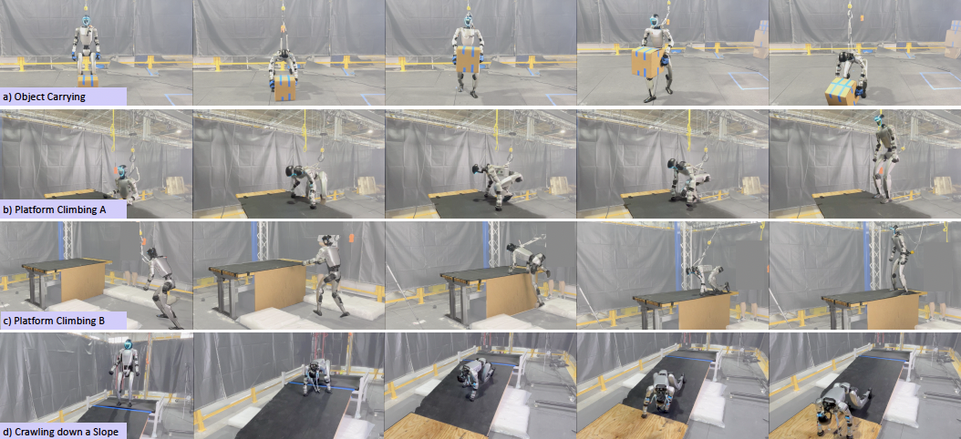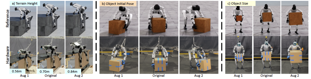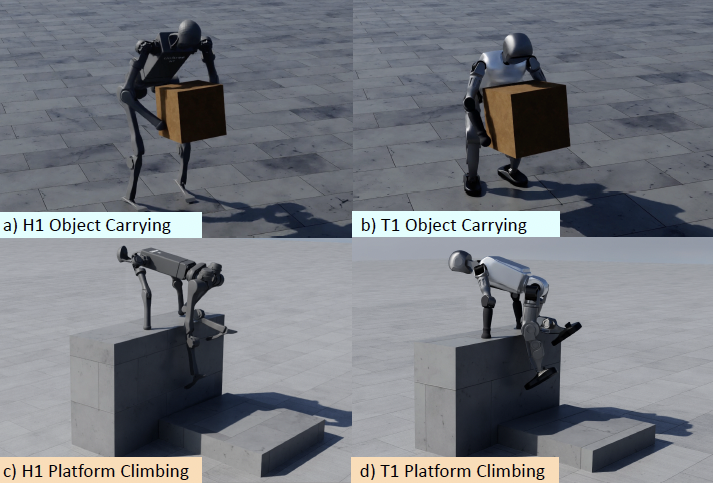 此外,相似动作会分组训练以加快策略收敛,不同的任务(如搬箱和平台攀爬)则采用不同策略设置。