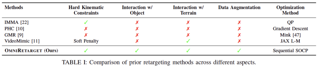 在与其他动作重定向方法的对比中,OmniRetarget 在所有关键方面:硬约束、物体交互、地形交互、数据增强表现出了全面的方法优势。