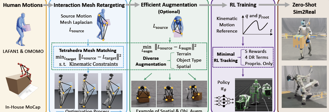 首先,OmniRetarget 通过基于交互网格(interaction-mesh)的约束优化,将人类示范动作映射到机器人上。