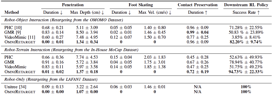 实验结果显示,在运动学质量上,OmniRetarget 在穿透、脚部打滑和接触保留指标上整体优于所有基线,即使偶尔轻微穿透也能被 RL 修复。