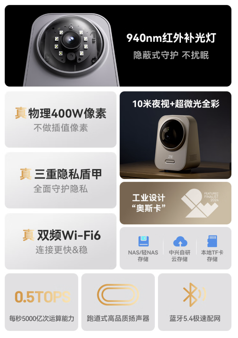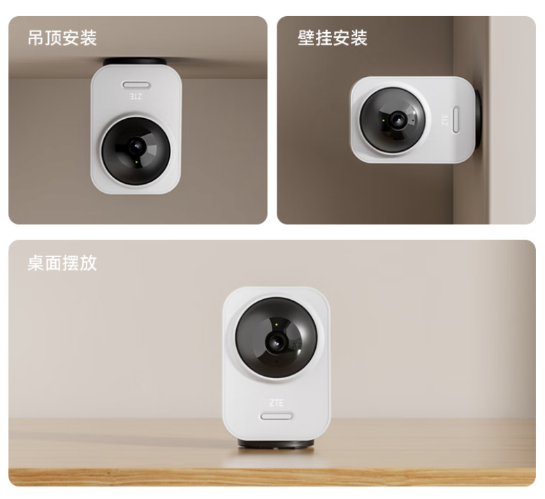 其他方面,该摄像头支持桌面摆放、壁挂、吊顶安装,支持 AI 人形检测功能,可使用中兴智慧生活 App 进行管理。