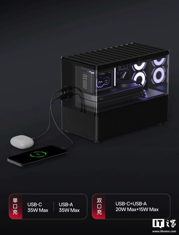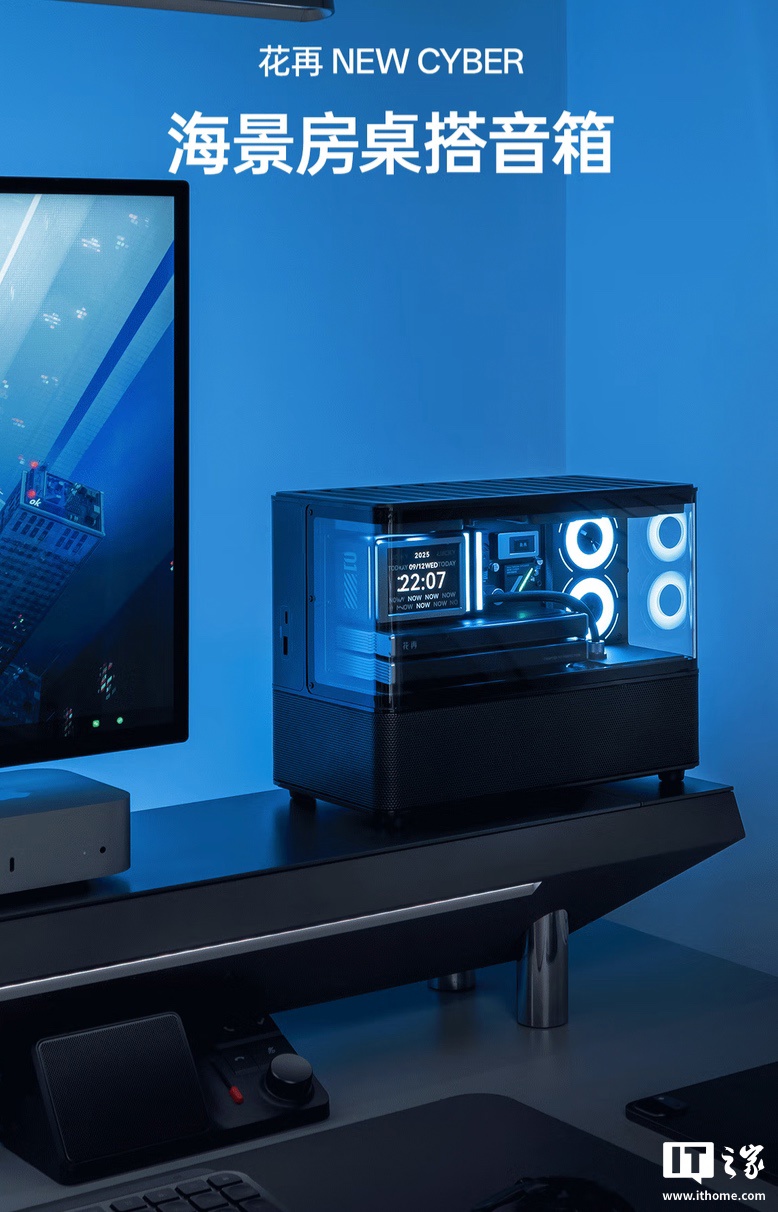 据介绍,这款音箱整体采用上下分区设计,下方为声学区域,上方的三面透明装饰区域除拟物风扇氛围灯外还容纳了电源管理模块、信号处理器模块、外露转接板,同时配备一块 2.8 英寸彩色面板,支持自定义显示文字、壁纸、动态歌词,同时还能连接电脑显示电脑状态。