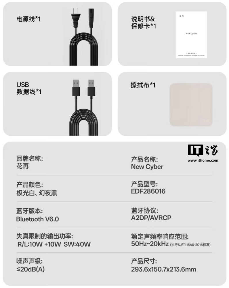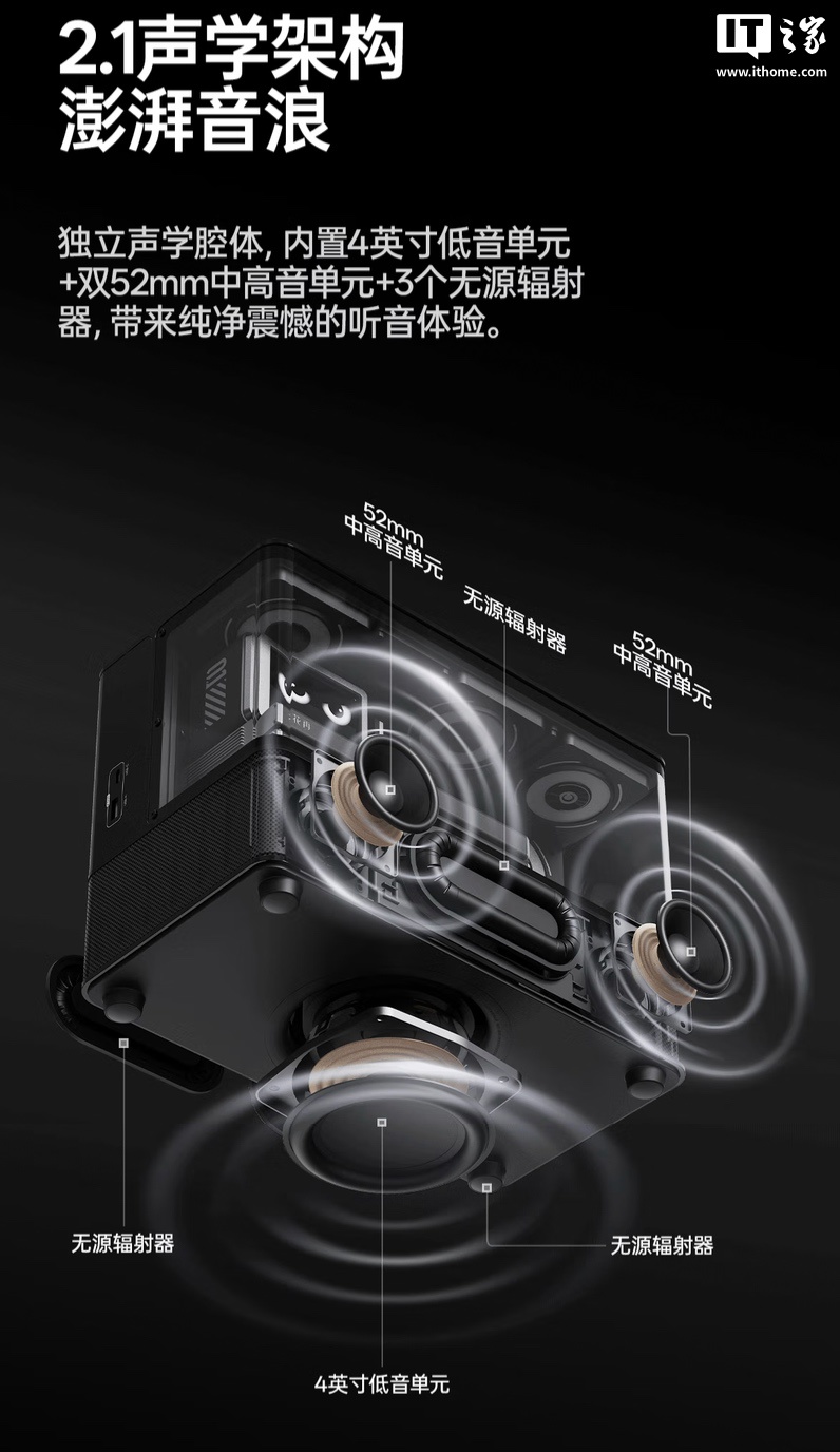 规格方面,该音箱搭载全 DSP 数字处理系统,配备双路 D 类数字功放,采用 2.1 声道声学结构,内置 1 个 4 英寸低音单元、2 个 52mm 中高音单元、3 个无源辐射器。并提供了 35W USB-A / USB-C 输出接口。
