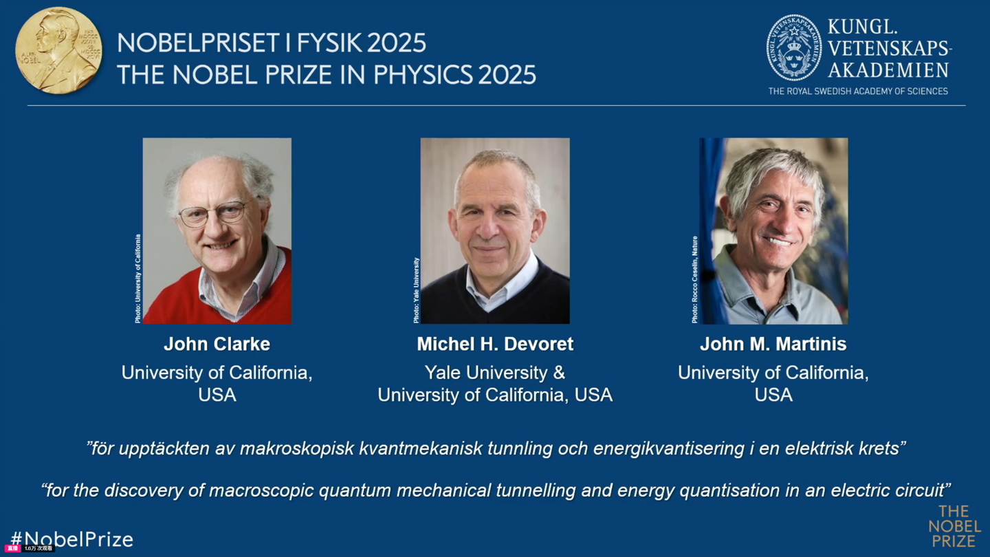 IT之家 10 月 7 日消息,瑞典皇家科学院决定将 2025 年物理学诺贝尔奖授予三人,,以表彰他们“在电路中发现了宏观量子力学隧穿与能量量子化现象”: