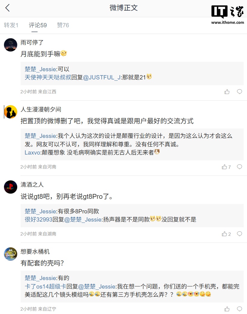 另外,realme 中国区 CMO @楚楚_Jessie 还在微博评论区与网友互动:针对新机月底能到手吗,她表示“可以”;针对是否有配套的壳,她回复“有的”。