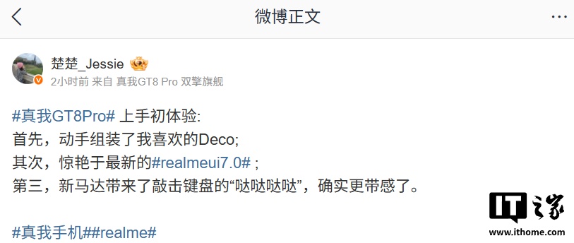 realme 中国区 CMO @楚楚_Jessie 今日发文分享了真我 GT8 Pro 手机的上手初体验,确认新机支持相机 Deco 个性化自定义,同时还公布了新机部分新特性。IT之家附原文如下: