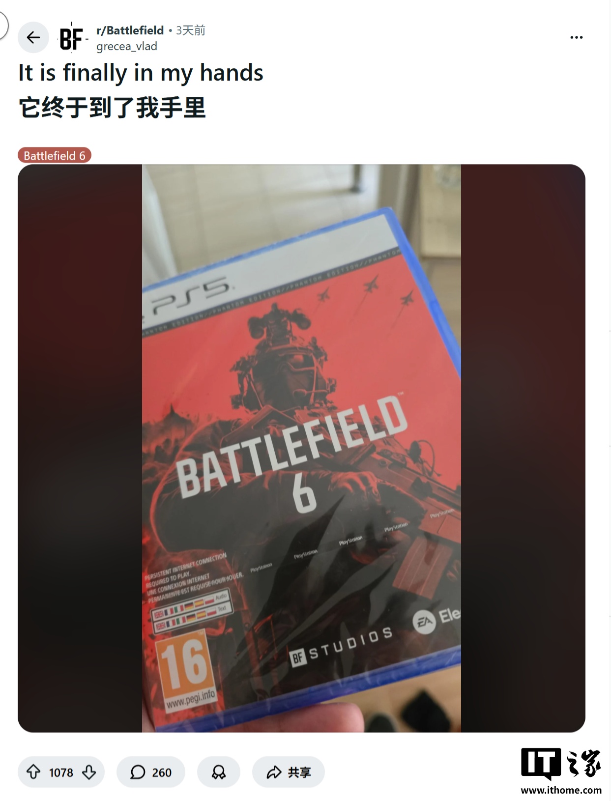 网友 @grecea_vlad 于 10 月 6 日在 Reddit 社区发帖,已经获得了《战地风云 6》游戏实体版 PS5 光盘,并透露玩家无需漫长下载,可直接安装并进入战场,这在大型 AAA 游戏中极为少见。IT之家附上相关截图如下: