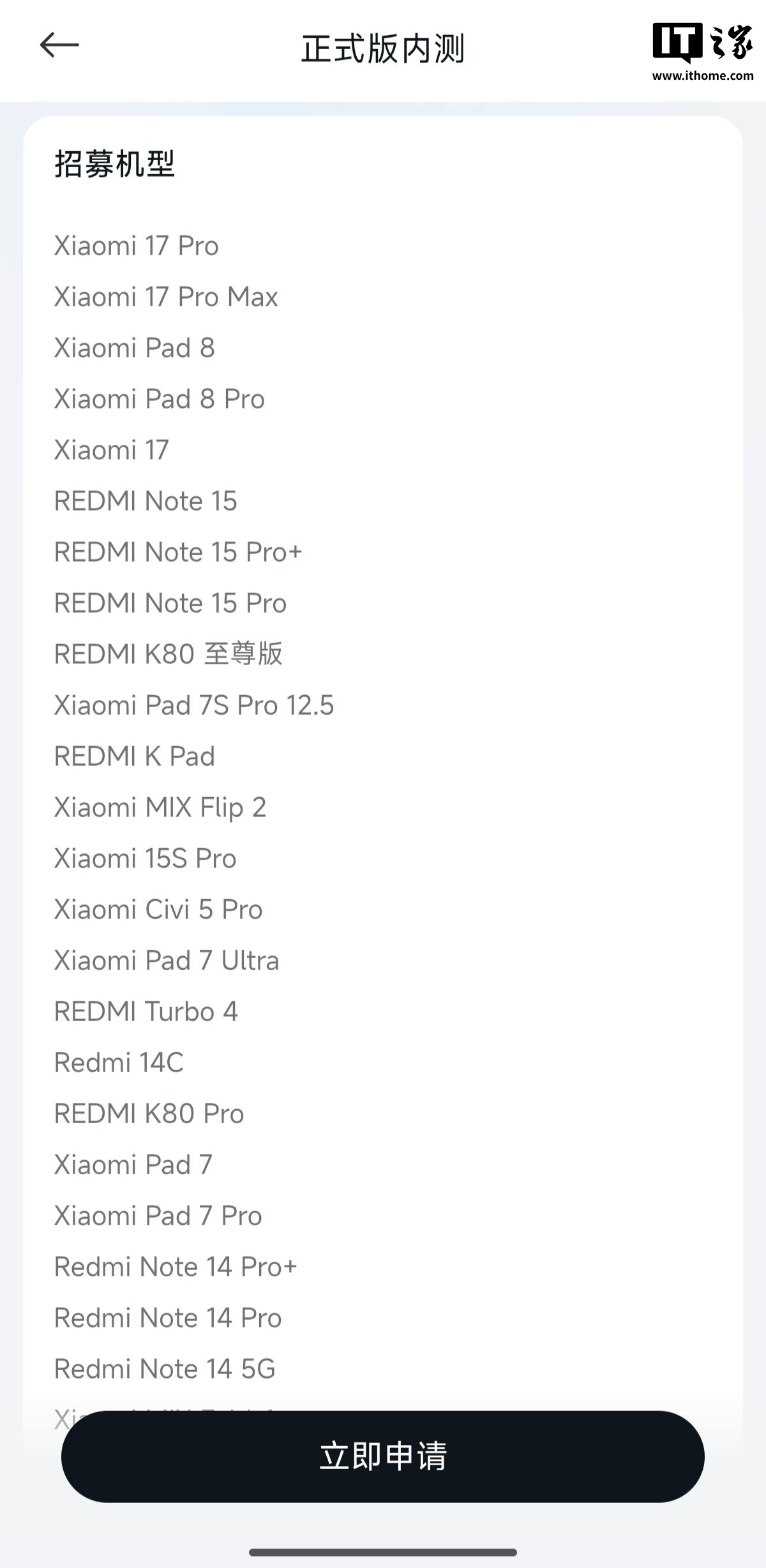 IT之家 10 月 9 日消息,小米 17 系列手机、小米 Pad 8 系列平板的澎湃 OS 3 正式版内测招募已开启,用户可前往小米社区报名申请。
