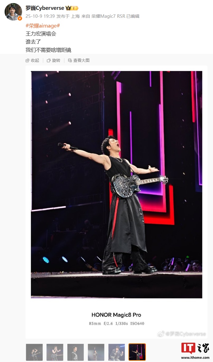 IT之家 10 月 9 日消息,荣耀首席影像工程师罗巍今日分享了 Magic8 Pro 手机在王力宏演唱会的拍摄样张,并直言“不需要啥增距镜”,暗指新机在演唱会场景下的长焦拍摄能力有所突破。