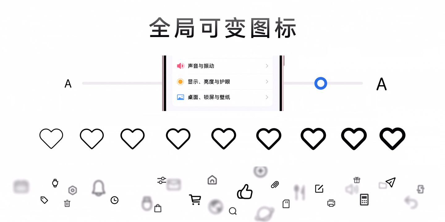 此外,系统小图标也被重新“格式化”并升级为更加强大的“全局可变图标”,不论字号大小都能和文字协调搭配。“无级可变”技术则让系统里的图标也能跟随文字进行无级调节,粗细程度都由用户决定。