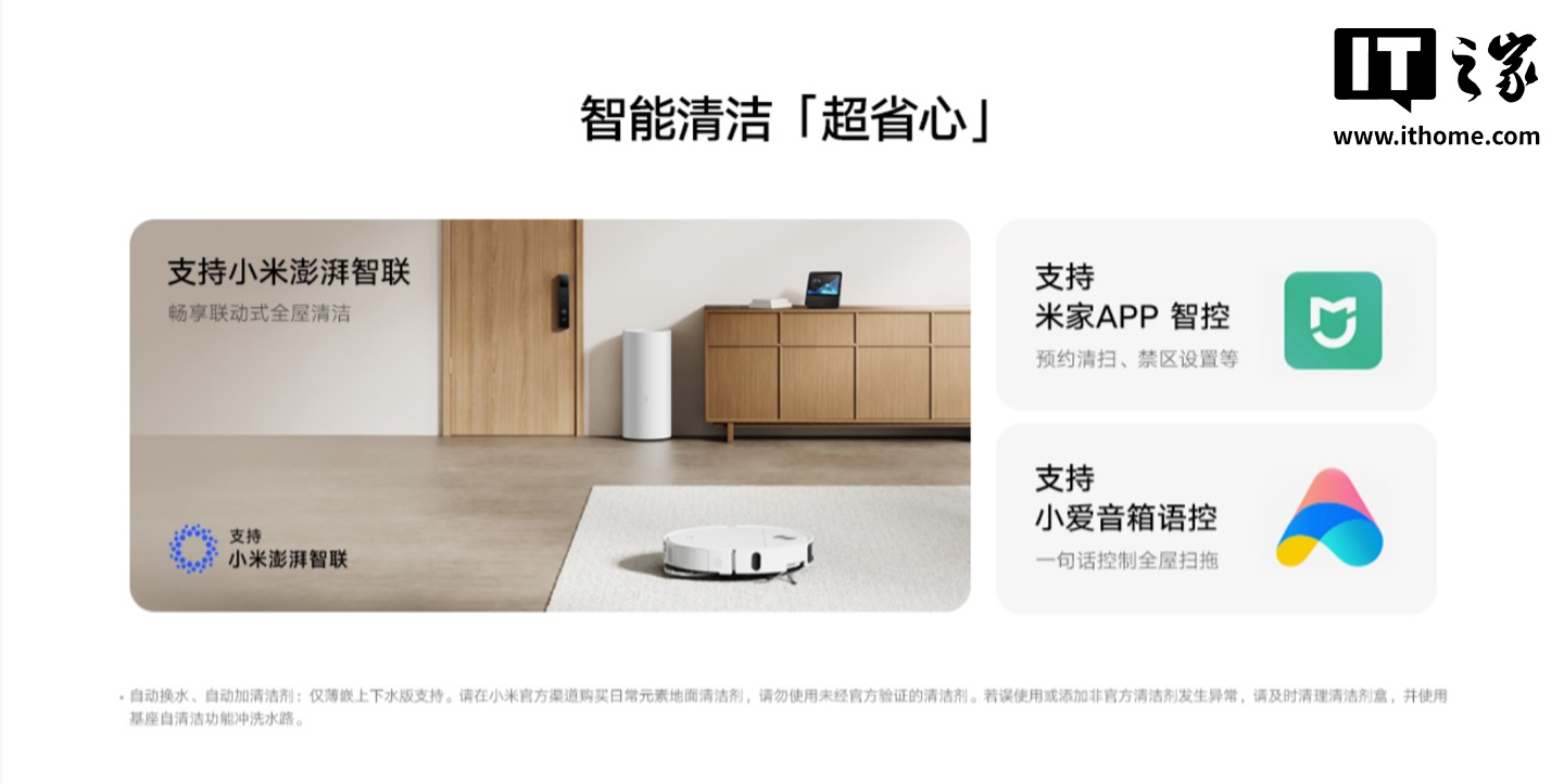 此外,这款扫拖机器人还支持米家生态和小米澎湃互联,使用米家 App 即可预约清扫、设置禁区等,出门在外时也可以远程启动机器人,也可与小米生态链的门锁、空气净化器、加湿器等设备联动,自行打造专属清洁场景。