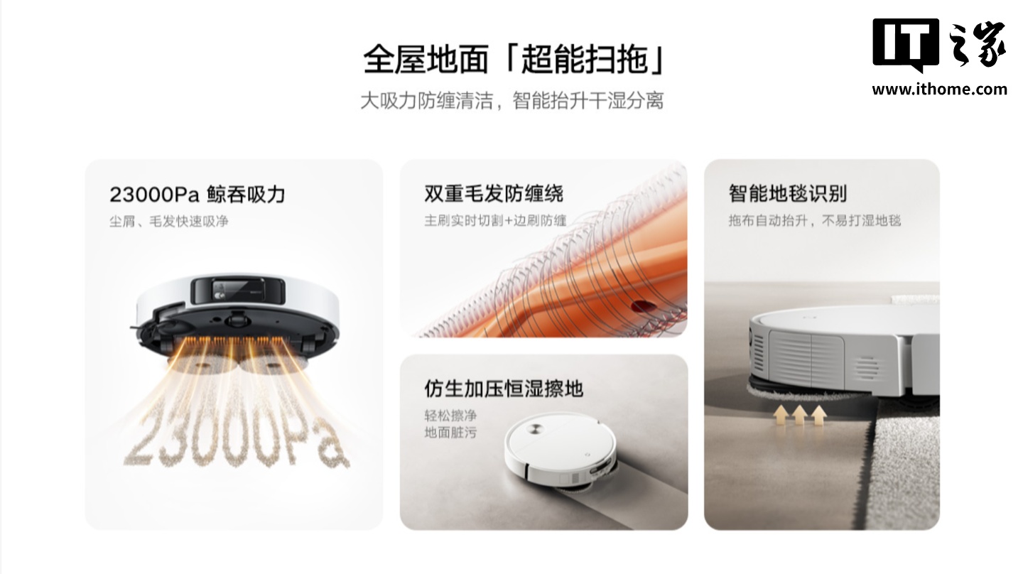 硬件方面,这款扫拖机器人配备 23000Pa 风机,号称“鲸吞吸力”,可将地面灰尘、大小颗粒物、碎屑、毛发等污物快速吸净,搭配“米家创新”双刀割毛主刷,可减少毛发纠缠,还配有仿生加压恒湿拖地系统,模拟人手擦地的形式拖地,配合主机独立水箱可实现 3 档拖布控水调节。
