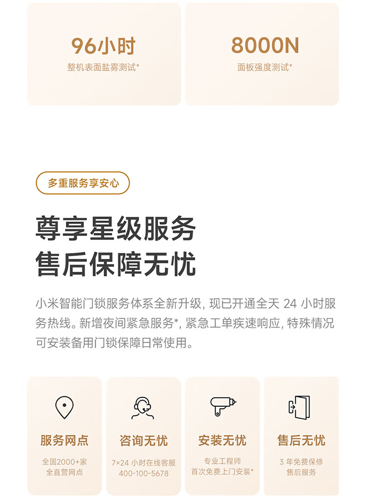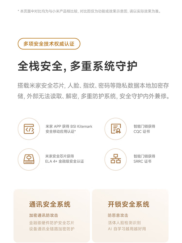 小米智能门锁 2 Pro 支持 10 种开锁方式,包括人脸、指纹、密码、临时密码、蓝牙设备、应急钥匙、NFC 门卡、小米手机、小米手表、小米手环;采用直插式 C 级锁芯贯穿锁体设计,防止技术开启或暴力拆卸。